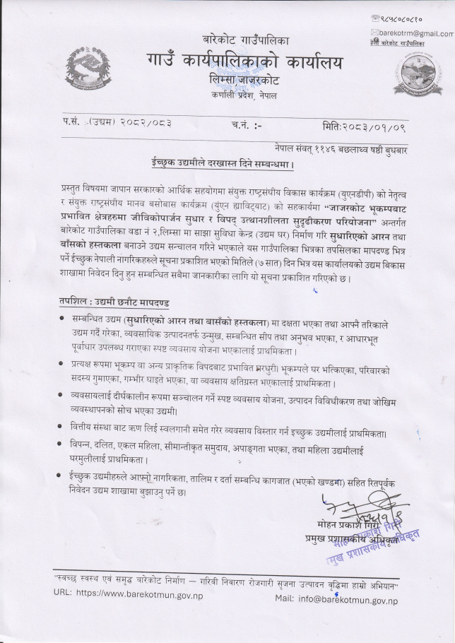ईच्छुक उद्यमीहरुले दरखास्त पेश गर्ने सम्बन्धी सूचना।