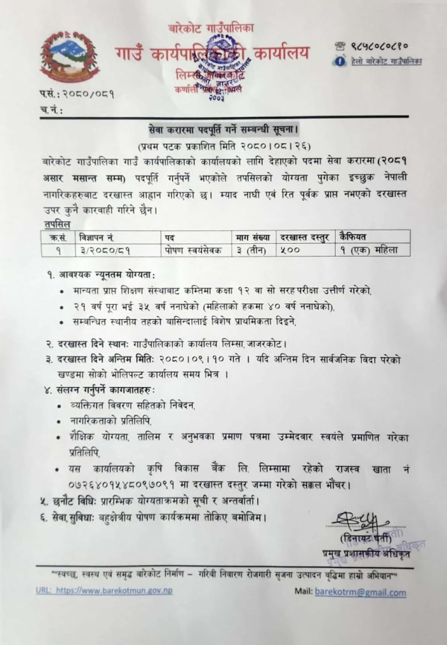 पोषण स्वयंसेवक सेवा करारमा पदपूर्ति गर्ने सम्वन्धी सूचना ।