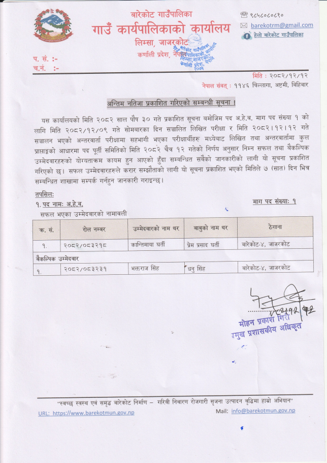 ०४-२०८२-०८३ सेवा करार अहेव पदको अन्तिम नतिजा प्रकाशित गरिएको सूचना